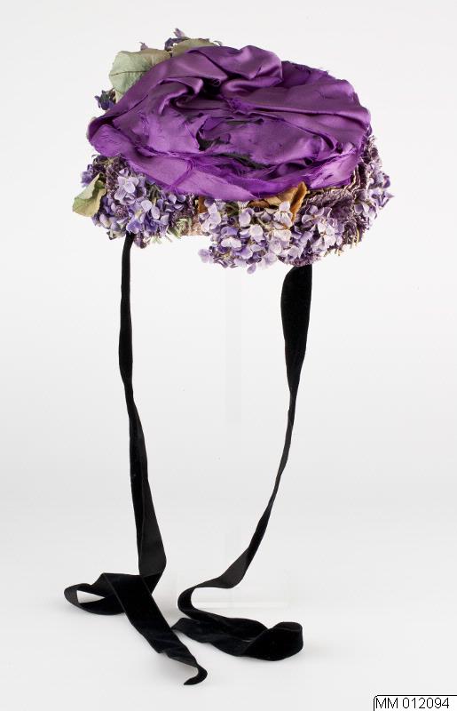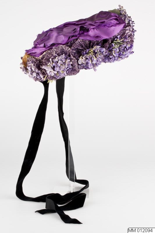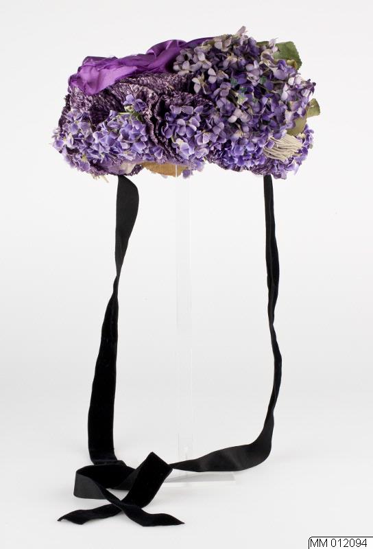 • Kapotthatt av violetta halmflätor. Kullen täckt av violett sidentyll. Hatten kantad av rundlar av violetta halmflätor garnerade med små buketter av violer av tyg. Svarta knytband av sammet.