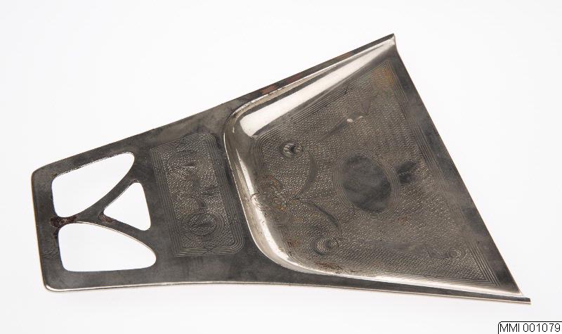 Sopskyffel för bordsbruk, rekatngulärt handtag, sidorna utvidgar sig i skyffeln, som är något nedsänkt, till triangulär form. 3 utstansade avrundade trianglar i handtaget, intryckt medaljongmönster på nätmönstrad botten. Märkning: EXCELSTOR NICKEL DAC".