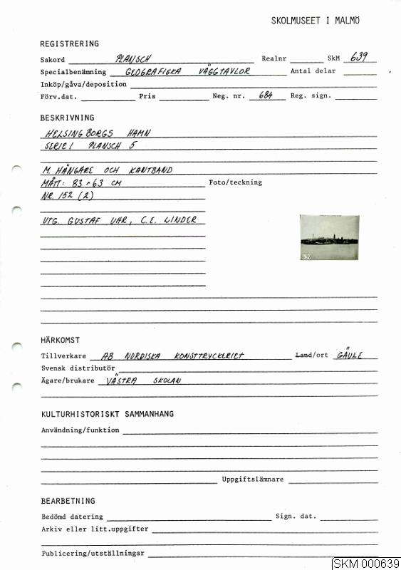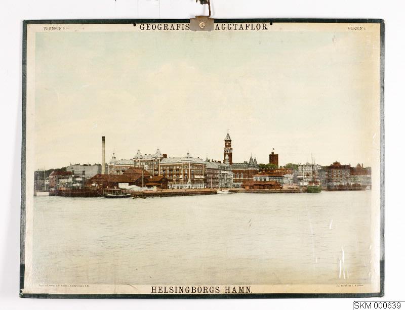 Helsingborgs hamn. Med hängare och kantband. Nr. 152 (2). Geografiska väggtaflor. Plansch 6. Serie 1. Tryck och Förlag: A.-B. Nordiska Konsttryckeriet, Gefle Utg.: Gustaf Uhr, C. E. Linder.