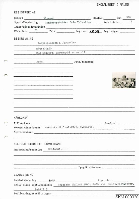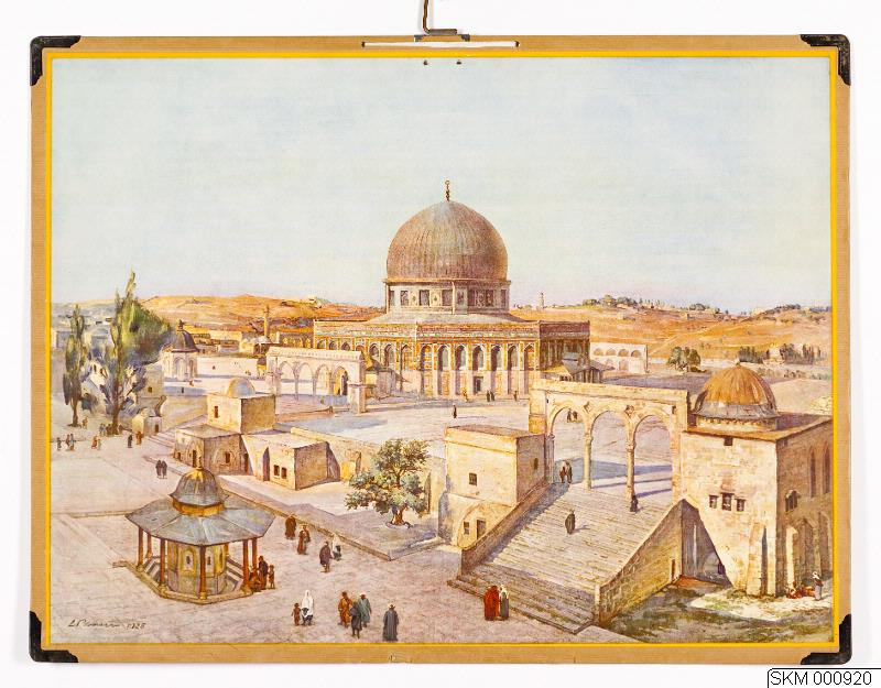 Palestina, Tempelplatsen i Jerusalem. Med hängare. Hörnskydd av metall. "L.H??? 1926" Blum. Text på baksidan: Palestina. 3. Tempelplatsen i Jerusalem. För tre religioner är Jerusalem en helig stad: för judendomen, kristendomen och mohammedanismen. Tempelplatsen bär vittnesbörd därom. Salomos tempel raserades av Nebukadnessar II år 586, ett nytt uppfördes efter fångenskapen, och detta ersattes i sin tur 36 f. Kr. med Herodes' tempel, förstört år 70. Efter Hadrianus' Jupiter-tempel följde så Konstantin den stores kristna kyrka. Den mohammedanska expansionen i början av 600-talet gjorde emellertid islamiterna till herrar över tempelplatsen fram till våra dagar — med ett undantag: korstågstiden under 1100-talet. Här uppfördes 691 Klippmoskén, mohammedanernas mest berömda helgedom efter Kaba i Mecka. Kalifen Omar, efter vilken moskén felaktigt uppkallats, har icke haft med anläggningen att skaffa. Förbi en brunn på förgården leda två trappor upp till det åttahörniga templet, som är utomordentlig skönhet. Det har fått sitt namn av den nakna, kala klippa, över vilken kupolen välver sig. Enligt legenden var det här människan en gång skapades. Det var också härifrån Mohammed for på sin häst till himmelen. Till vänster om templet synes en minaret, varifrån böneutroparen kallar de troende till andakt. Vi se endast mohammedaner på bilden, då den föreställer en eftermiddag och "otrogna" äga tillträde blott på f. m. Bakom templet skymtar östra stadsmuren och i bakgrunden Oljeberget. Till höger utanför muren se vi den grekisk-ortodoxa Getsemane-kyrkan. Till vänster om kupolen skönjes i fonden det hebreiska universitetet, öppnat 1925, judendomens andliga centrum i Palestina. Svenska skolmaterielförlaget Gunnar Saietz A.-B.