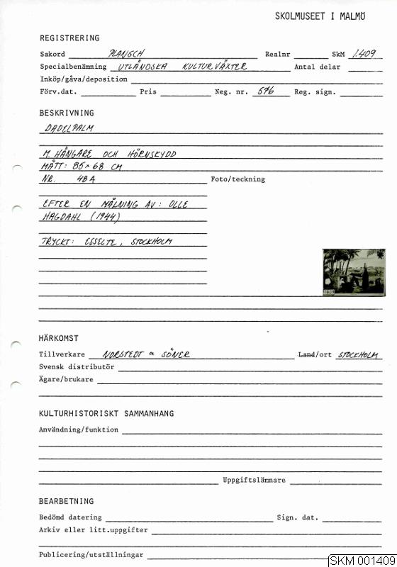 Utländska kulturväxter: Dadelpalm. M. hängare och hörnskydd. Nr. 48A. Efter en målning av: Olle Hagdahl (1944). A.-B. P.A. Norstedt & Söner. Tryckt: Esselte Stockholm.