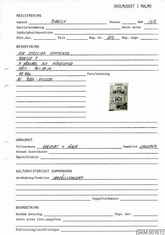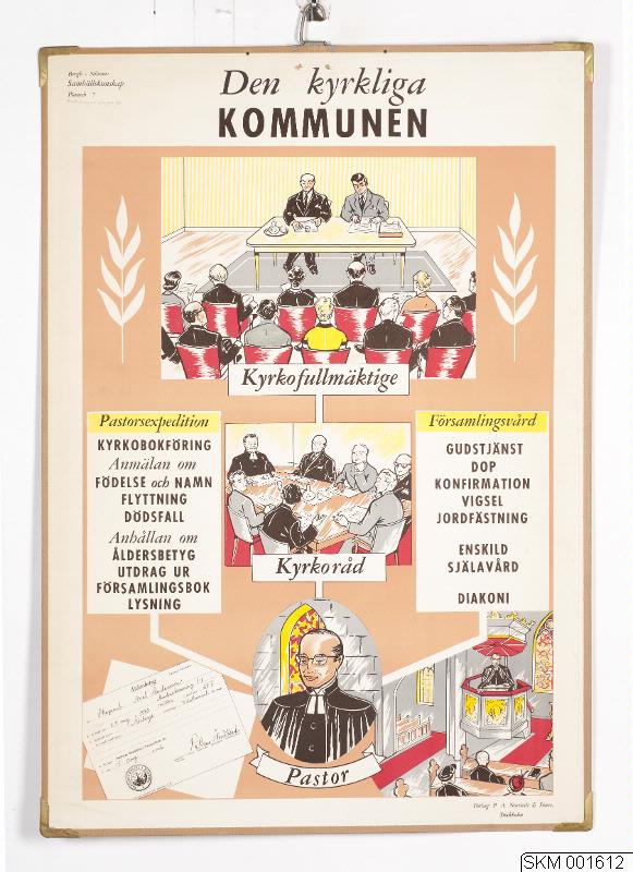 Den kyrkliga kommunen. M. hängare och hörnskydd. Nr. 886. Av: Bergh - Nilsson. Samhällskunskap. Plansch 7. Förlag: P. A. Norstedt & Söner, Stockholm Överst i bilden visas "Kyrkofullmäktige", under dem står "Kyrkoråd", och längst ned "Pastor". Från honom leder linjer till två rutor: "Pastorsexpedition" med "Kyrkobokföring, Anmälan om födelse och namn, flyttning, dödsfall, Anhållan om åldersbetyg, ...