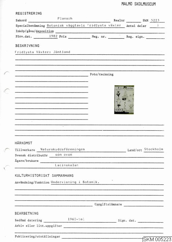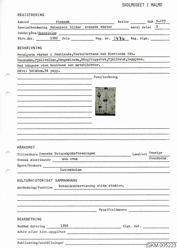 Plansch: Växter: Fridlysta, vackra och märkliga växter i Jämtlands, Västerbottens och Norrbottens län. Med hängare utan kantband och metallhörnor. På papp. Svenska naturskyddsföreningen 1956. Hedmans lito., Gävle.