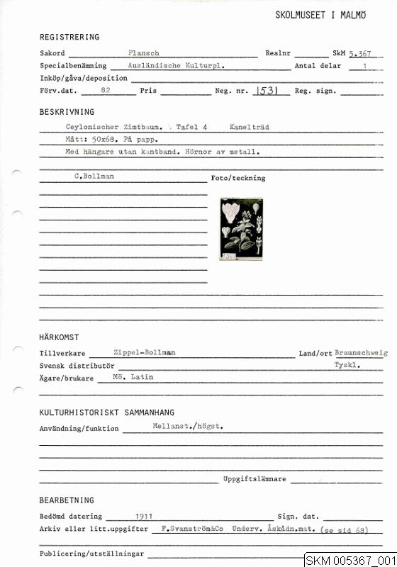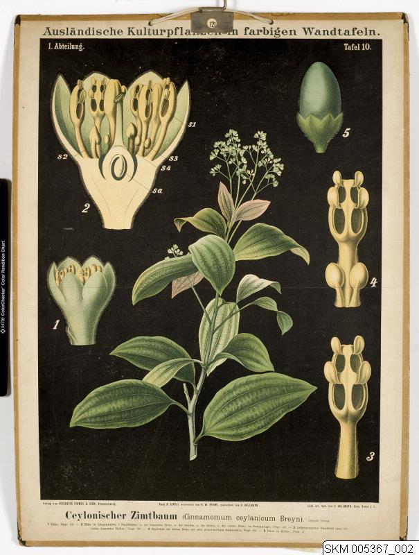 Plansch: Ausländische Kulturpflanzen. I. Abteilung. Tafel 4. Ceylonischer Zimtbaum. Kanelträd. Med hängare utan kantband. Hörnor av metall. Konstnär: C. Bollmann. Zippel, Bollmann. Verlag von Friedrich Vieweg & Sohn. Bollman, Gera, Reuss.