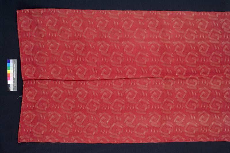 • Draperi, ett par, av mönstervävt konstsilke, maskinsytt. Vinröd bottenfärg med mönster i beige. Ofållad nertill, beiga veckband fastsydda upptill.