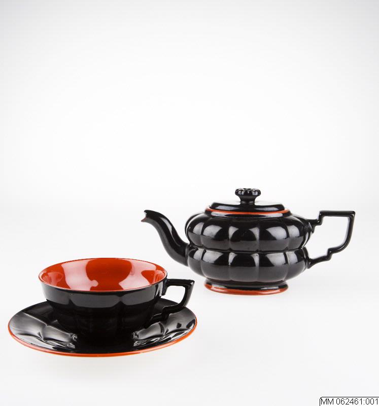 Tekanna av svartglaserat porslin ,invändigt glaserad med rostbrun glasyr. Rostbrun delorkant upptill utmed locket och nedtill utmed foten.Kannan stämplad i botten; Gefle Made in Sweden AP