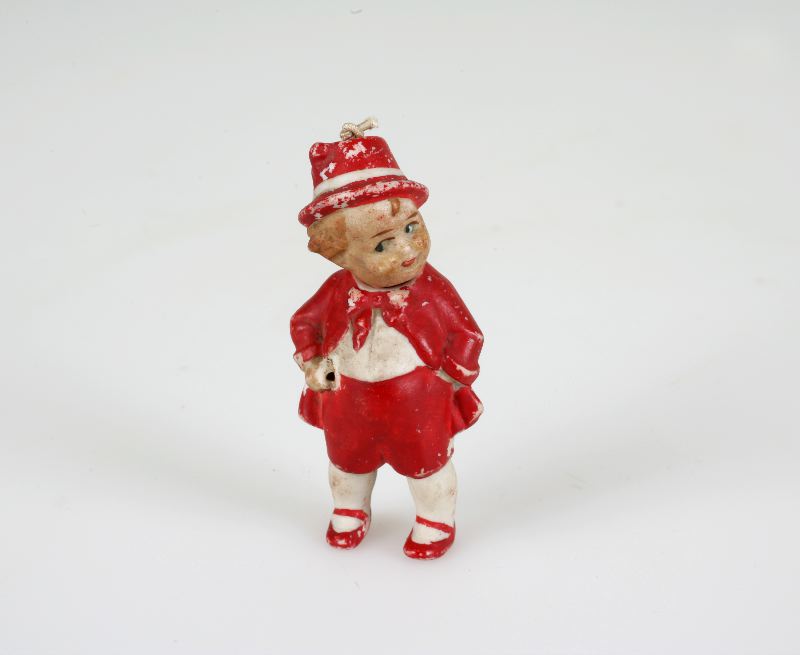• Docka, pojke, av porslin med rörligt huvud. Röd rock och kortbyxor, brunt hår, röd tyrolerhatt. Märkt "Germany".