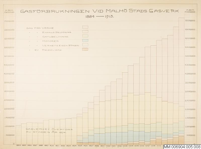 Stapeldiagram över "Gasförbrukningen vid Malmö Stads Gasverk 1884-1913". Varje år redovisas i form av en stapel som växer i storlek i takt med förbrukningen. Från 1895 finns 6 olikfärgade stapelsegment som redovisar "Gas för värme / ensk: Belysning / Gatubelysning / Gas för motorer / Verkets förbr. / ej redovisad". I vänster och höger kant finns kubikmeterskalan, i nedre kant årsföljden. I diagram...
