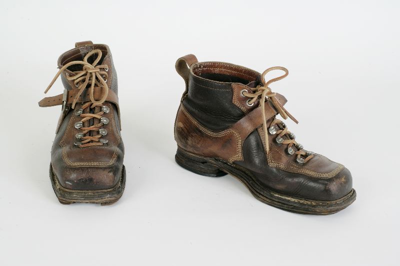 • Pjäxor av mörkbrun älghud. Påsydd bakkappa med vristrem samt framparti av ljusbrunt skinn. 4 par metallhyskor och 4 par snörhål för snörning.