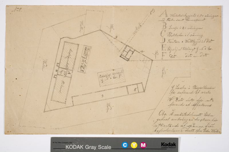 Tomtplan i blyerts. Byggnadernas rumsindelning och användning är angivet.