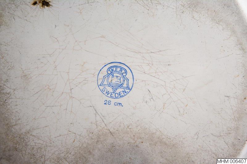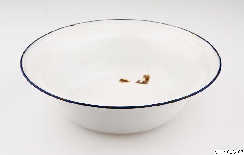 Rund, flat botten, utåtvidgade sidor, utböjd kant.Vit med blå dekor runt mynningskanten.