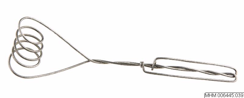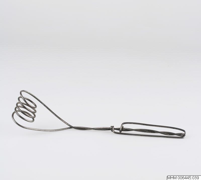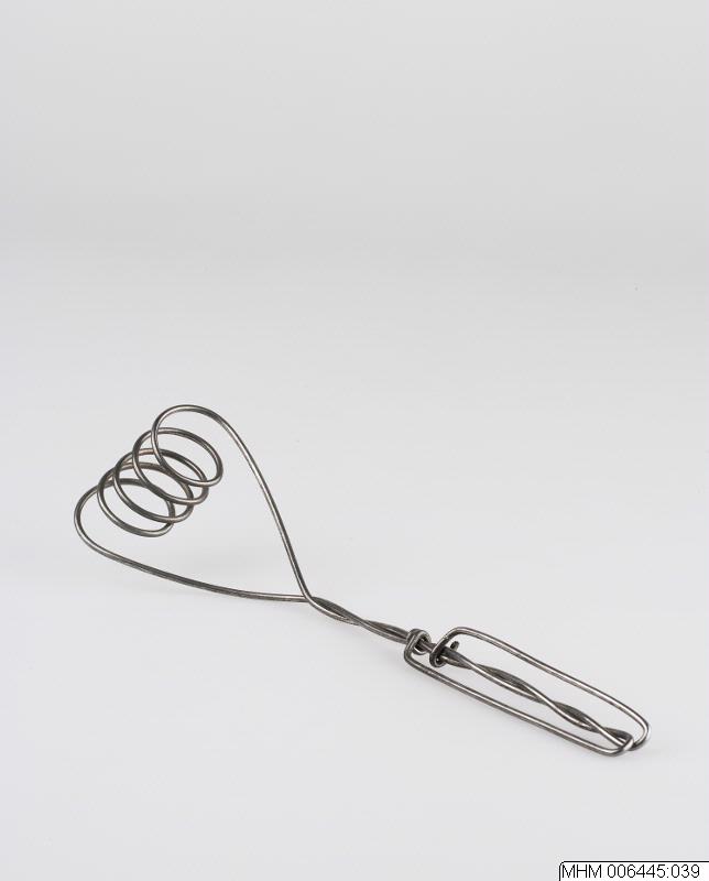 Konstruktion av grövre metalltråd. Själva vispen består av sex horisontella, parallella spiraler (cirkelformade). De yttre spiralerna går ner i skaftet (l. 20 cm) och bildar därvid en konform. Trådarna viras ihop i skaftets början, delar på sig vid dess slut för att sluta med två öglor på skaftets mitt.