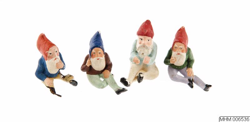 Tomtefigurer med skägg och toppluva, kolt och smala byxor. Tomtarnasitter med ena benet sträckt och andra benet vikt.