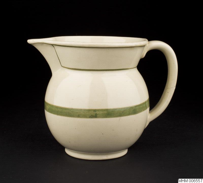 • Vitt porslin med mellangrön 1 cm bred rand runt buken, smalare ränder runt brädden. Runt mittparti och utåtsvängd brädd, kort snip, tvärgrepe.