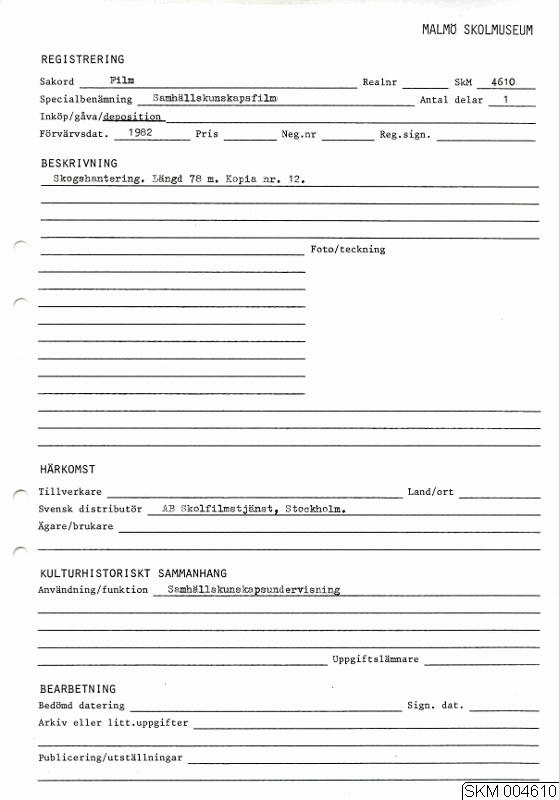 • Samhällskunskapsfilm angående skogshantering. Längd 78 min. Kopia nr. 12.