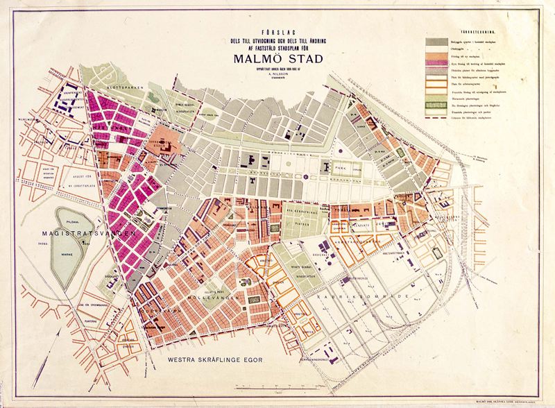 Text över kartbilden: Förslag / dels till utvidgning och dels till ändring / af faststäld stadsplan för / Malmö stad / upprättadt under åren 1899-1902 af / A. Nilsson / stadsingeniör.