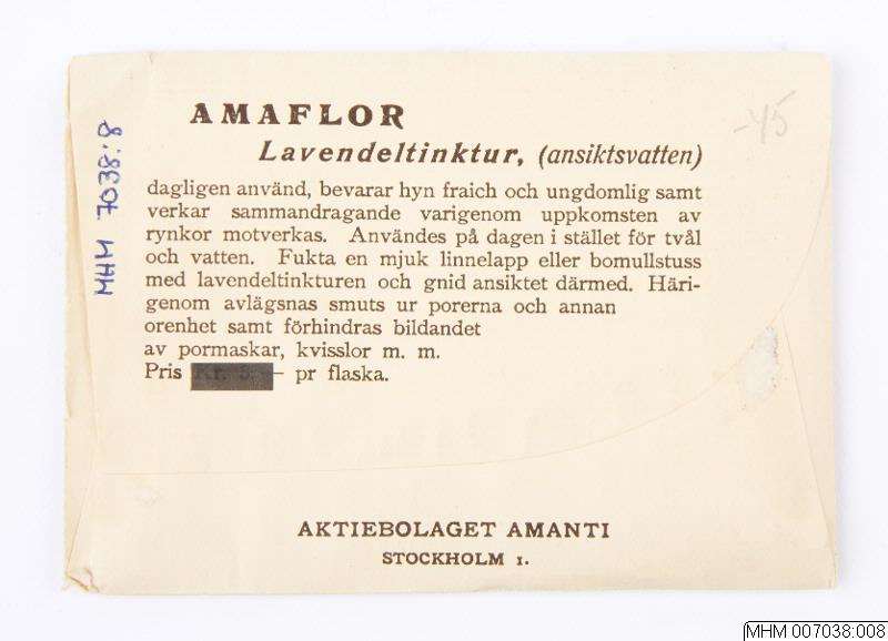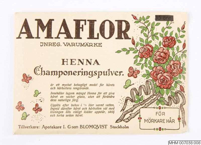 Förpackning för shampoo av papper. På framsidan med vit bakgrund en rosenbuske med röda rosor och gröna blad. Text: "Amaflor / inreg. varumärke / Henna / Champoneringspulver. / Är ett mycket behagligt medel för hårets / och hårbottens rengörande. / Innehåller lagom mängd henna för att giva / håret en vacker glans, utan att förändra / dess naturliga färg. / Upplös efter behov i 1/3 liter varmt vatten, / Ingnid därefter håret och hårbotten väl med / lösningen tills rikligt lödder uppstår, skölj / och torka sedan håret. / Tillverkare: Apotekare I. G:son Blomqvist Stockholm". På baksidan med vit bakgrun texten: "Amaflor / Lavendeltinktur, (ansiktsvatten) / dagligen använd, bevarar hyn fraich och ungdomlig samt / verkar sammandragande varigenom uppkomsten av / rynkor motverkas. Användes på dagen istället för tvål / och vatten. Fukta en mjuk linnelapp eller bomullstuss / med lavendeltinkturen och gnid ansiktet därmed. / Häri- / genom avlägsnas smuts ur porerna och annan / orenhet samt förhindras bildandet / av pormaskar, kvisslor m.m. / Pris Kr. 5:- pr flaska. / Aktiebolaget Amanti / Stockholm 1."