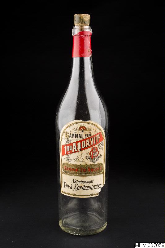 Cylindrisk, svagt rundad övergång till halsen, markerad mynningskant. Pappersetikett med texten: GAMMAL FIN (svart text) lma AQUAVIT (vit text i rött fält) Gammal fin Aquavit (röd text på bruna vinfat) Aktiebolaget Vin- & Spritcentralen (svart text) Kork med rester av buteljlack.