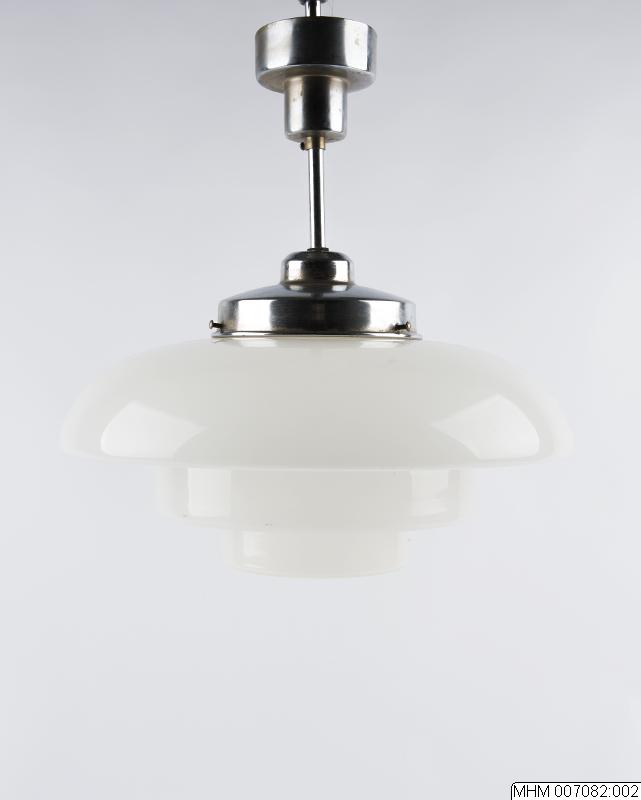 Rund kupa i vittmjölkglas, tillverkad i ett stycke. Ovandelen välvd, nederdelen formad som två olikstora cylindrar med horisontellt parti emellan. Överkanten utåtböjd som fäste för hållarens skruvar. Hållaren av järn, cylindrisk med något kupig ovansida och en mindre kupig deli mittengenom vilken stången löper, en vuls kring hållarens nederkant. Strax ovanför denna tre vågräta skruvar på jämnt av...
