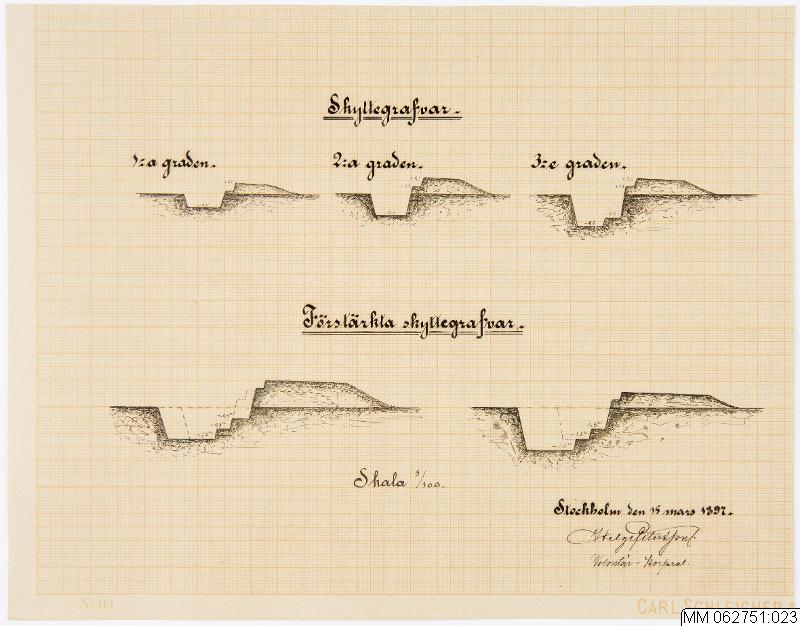 Profilritningar med huvudrubrikerna "Skyttegrafvar" och "Förstärkta skyttegrafvar", elevarbete utfört av Helge Petersson under sin utbildning på underofficersskolan i Stockholm 1896-97. Vi ser 5 profilritningar som beskriver olika typer av skyttegravars anläggning och mått.