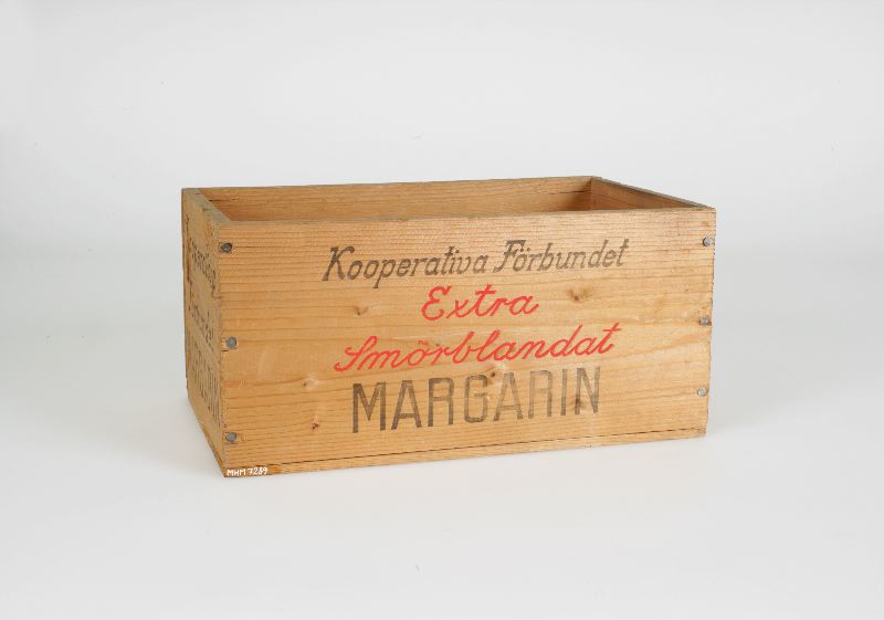 • Margarinlåda av fur, märkt "Kooperativa Förbundet Extra Smörblandat Margarin".