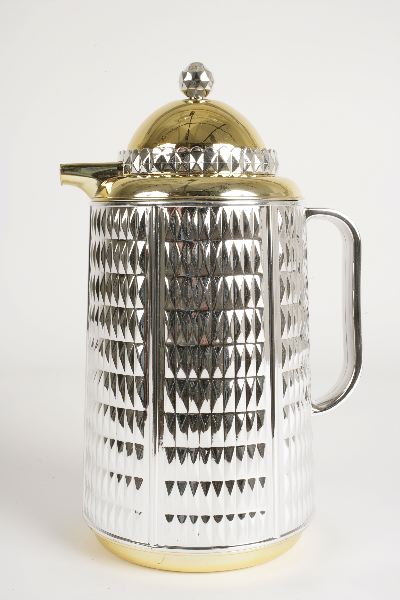 Termoskanna i silver och guldfärgad palst. Invändig flaska av termosglas. Skruvlock och handtag.Stämplad i botte: Model Japan