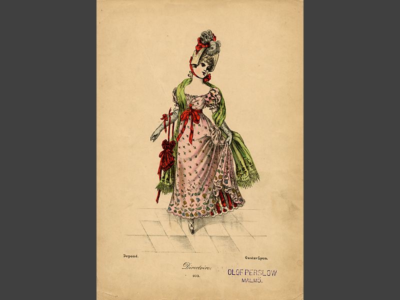 Modeplansch med illustration av Gustav Lyon under rubriken "Directoire". Kvinnlig modell i fantasifull / historisk klädedräkt. Namnstämpel på tryckarket: Olof Perslow. Malmö. Förmodad bilaga till modetidskrift. Tryck nr 103.