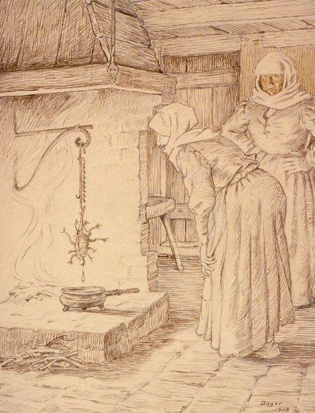 Vänstra halvan av bilden upptages av en öppen tegelstensmurad eldstad med träpanel på överkåpan. En liten eld brinner i hörnet. Framför står en trebent järngryta med handtag. I en järnkrok över grytan hänger några grodor som droppar blod. Framför eldstaden till höger står två kvinnor, en böjd och en med händerna i midjan. Båda är klädda i huvuddok och fotsidd klädnad. Bakom spisen skymtar en träpall och en trädörr. Bilden finns somm illustration i boken MALMÖ GENOM 600 ÅR, Tidskriftsförlaget Allhem AB, Malmö 1940 i uppsatsen HÄXOR OCH HÄXPROCESSER I MALMÖ sid. 85 med bildtext: Häxor tillreda en trolldryck. Bilden finns som illustration i historieboken för mellanstadiet: GENOM TIDERNA 3 av bl.a. Bengt-Åke Häger, Universitetsförlaget DIALOGOS AB 1992, sid 23.
