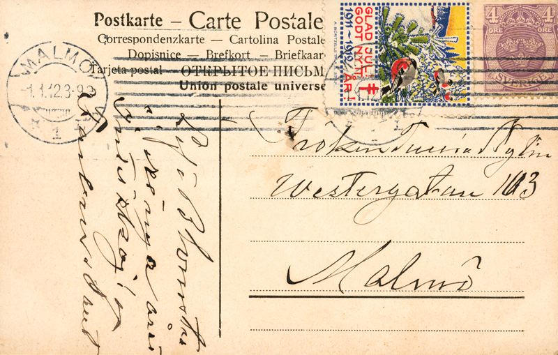 Brevkort adresserat till Fröken Tullia Nylin, Westergatan 103, Malmö.Poststämplat i Malmö 1.1.12.