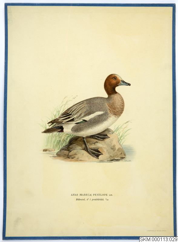 Tretton stycken papplådor med allt som allt 361 planscher över Nordens fåglar.Bläsand, hane i praktdräkt. Avbildad i 5/10 storlek.