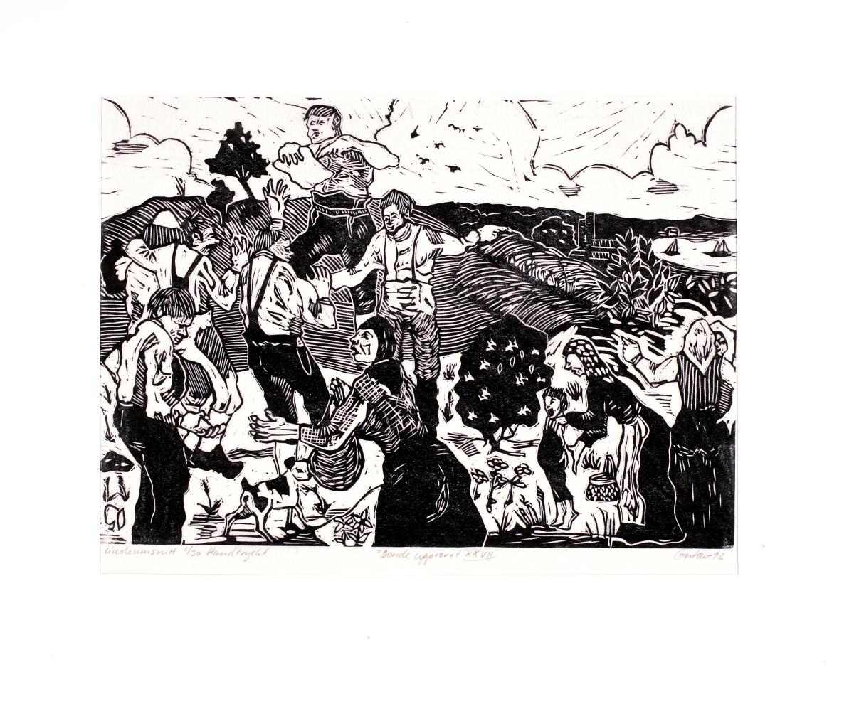 Linoleumsnitt 1/30 Handtryckt "Bondeupproret XXVII" GertOve 92. Utomhusscen med folksamling på åker. Högst upp i bilden en bonde som läser ur ett papper han håller i handen. De närmsta tre åhörarna verkar reagera med glädje på informationen. I förgrunden framför dem en bonde som bekymrat tittar på något han håller i handflatan, till höger om honom en gumma med ena armen framsträckt mot bonden och i den andra handen en kasse. Mellan dessa två finns en hund som blickar bort mot höger där en tredje grupp bondkvinnor är samlade. Två av dem är i samspråk, antagligen om informationen de just fått, medan en tredje daskar ett barn i rumpan. Landskapet tonar ut i fjärran och i bakgrunden skymtar man stadsbebyggelse med fabriksskorstenar och en havsvik med segelbåtar.