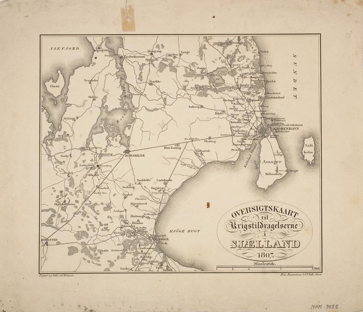 Militär översiktskarta av delar av Skälland. Till vänster finns Isefjord, i mitten Roskilde samt till höger Köpenhamn med Kögebukten och Sundet. Text: OVERSIGTSKAART til Krigstildragelserne i SKAELLAND 1807.