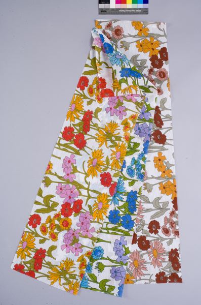 Tygprover av tunna, tryckta bomullstyger. 3 olika färgställningar är ihoplagda i en bunt. Tyget är glest vävt i vitt och tryckt i fyra färger. Mönstret är ganska stora stiliserade blommor på stjälk grupperade efter sort. På varje prov sitter en liten klisterlapp med ett nummer.
