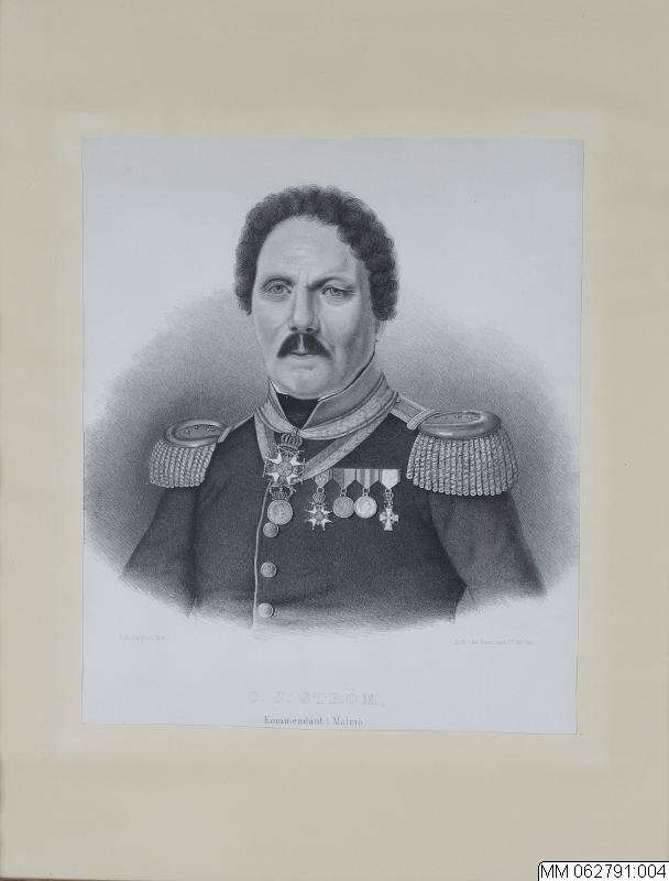 Litograferat porträtt av fängelsekommendanten i Malmö, C. J. Ström. Vi ser honom avbildad rakt framifrån i midjehöjd. Han är klädd i uniform, dekorerad med ordnar. Han har mörkt, krulligt hår och en kort, ansad, mörk mustasch.