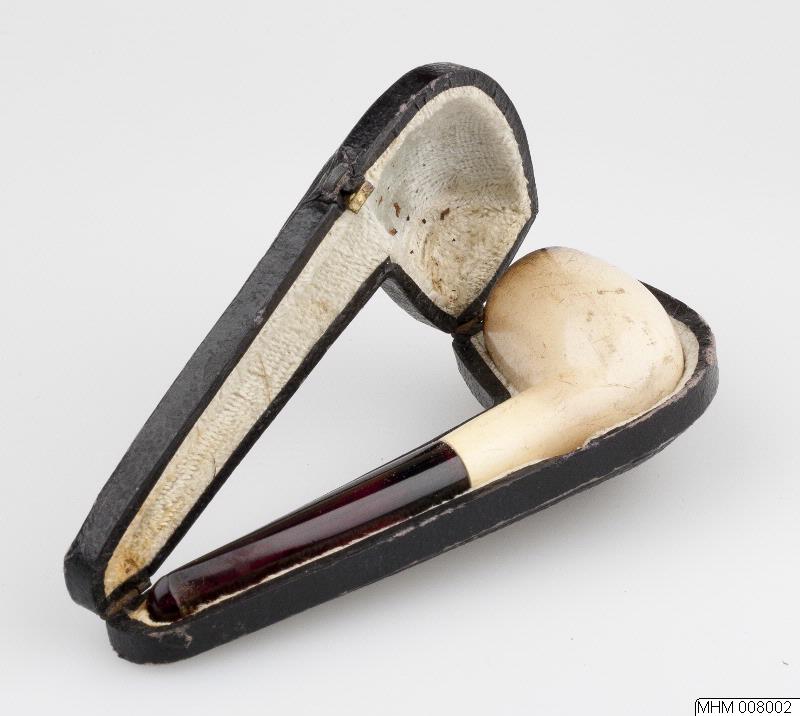 • Pipa med vitt sjöskumshuvud och bärnstensmunstycke. Tillhörande etui till pipa. I etuiet en etikett med texten: "Garanteed Real Meerschaum".