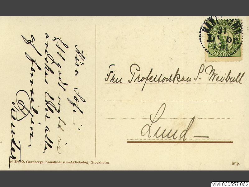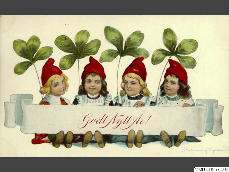 Nyårskort, fyra sittande flickor med röda luvar hållande band med texten: Godt Nytt År! Signerat i nedre högra hörnet: Jenny Nyström. Adresserat: Fru Professorskan S. Weibull / Lund.