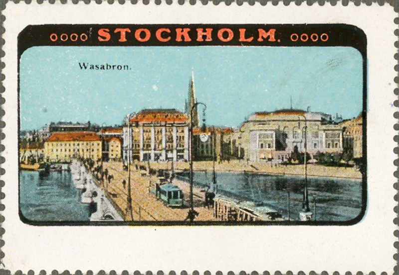 • Blått, rött, svart och ljusbrunt tryck på vitt papper. Wasabron -Stockholm.