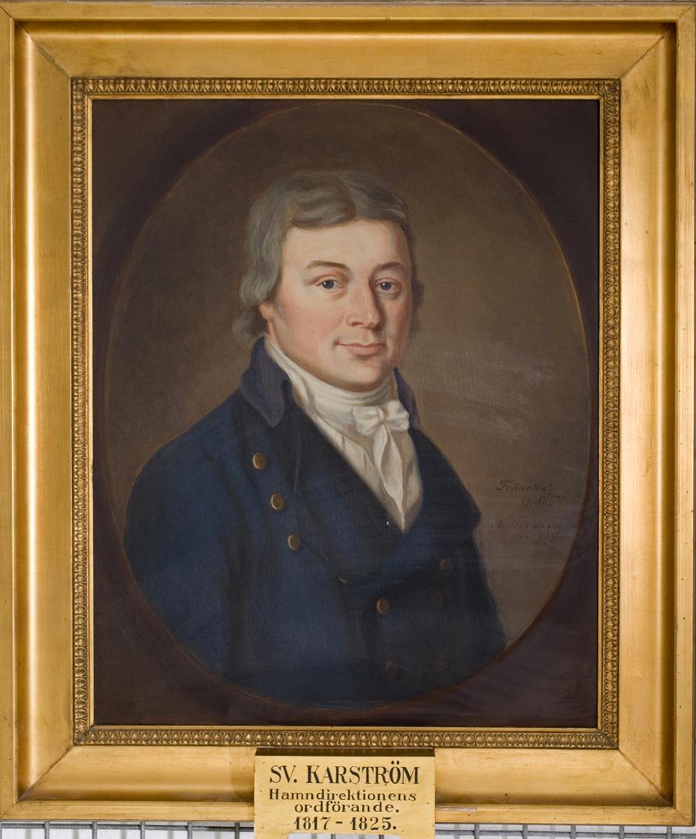Oljemålning, porträtt av Svedin Karström Hamndirektionens ordförande 1817-1925. Ram av förgyllt trä slät hålkäl med smal list i jouisk kymation. Bredd 10 cm. Förgylld träskylt med inskription: SV. Karström Hamndirektionens Ordförande. Bröstbild fas till vänster. Grått mittbenat hår, vid sidorna nedkammat över öronen. Vit halsduk och liten vit rosett. Vit väst med uppstående krage. Blå rock med hög dubbelvikt krage och stora slag. Fig. i ljust gråbrun oval inskriven i brun rektangel. Inskription på dukens baksida: Sv. Karström f.17 -d.18 Ordförande i Malmö Hamndirektion 1817-1825 Efter miniatyr af Fränckel tillhörig fröken Lizzie Möller, Lund.