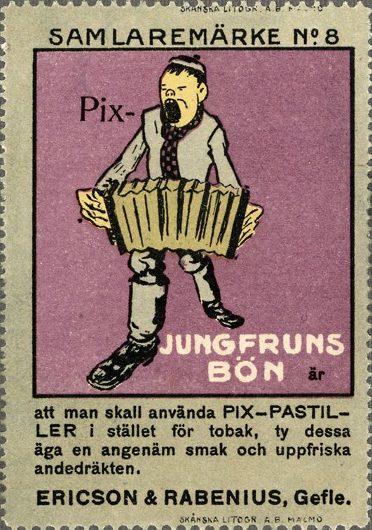 • SAMLAREMÄRKE No. 8. PIX----JUNGFRUNS BÖN ÄR ATT MAN SKALL ANVÄNDA PIX-PASTILLER I STÄLLET FÖR TOBAK, TY DESSA ÄGA EN ANGENÄM SMAK OCH UPPFRISKA ANDEDRÄKTEN. ERICSON & RABENIUS, GEFLE.