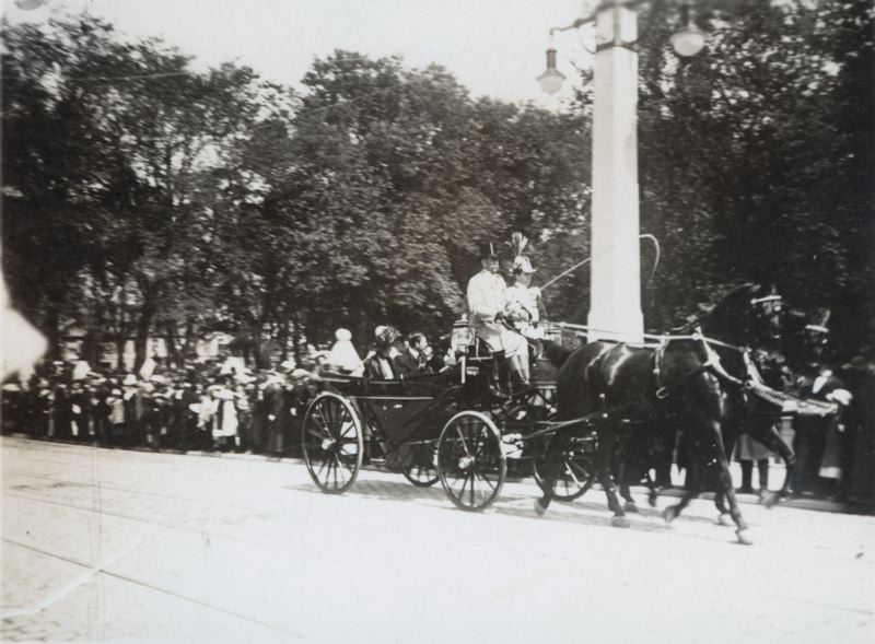 Kort, fotografi: En hästdragen vagn med kronprins Gustaf Adolf och kronprinsessan Margareta passerar över Fersens Bro i Malmö på väg till Baltiska Utställningens invigning 15 maj 1914. Text på baksidan: Kronprinsen åker till Baltiska utställningens öppnande 15 maj 1914. 1940, XVIII.