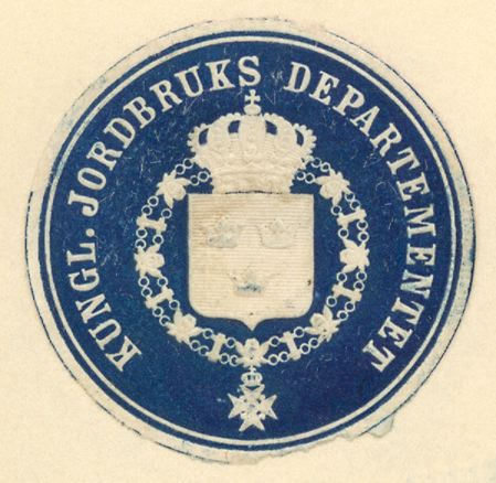 • Sigill för Jordbruksdepartementet inklistrat i album. Blått tryck på vitt papper.