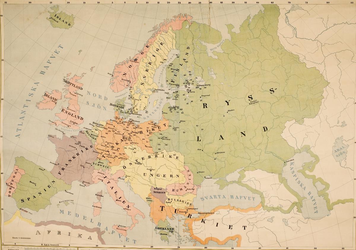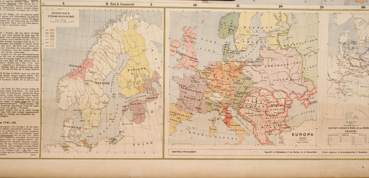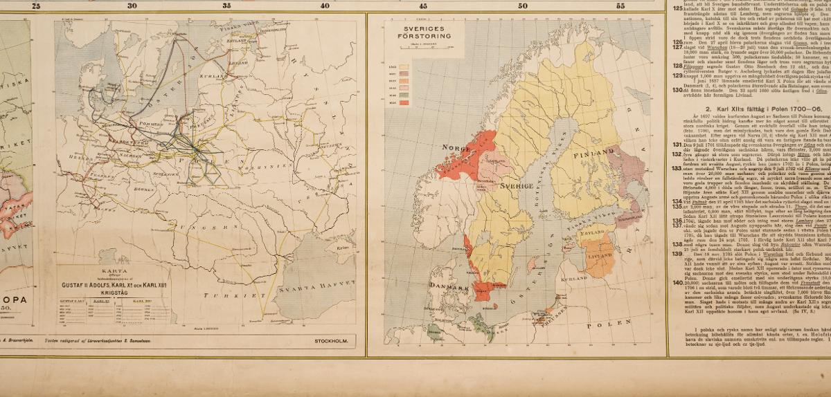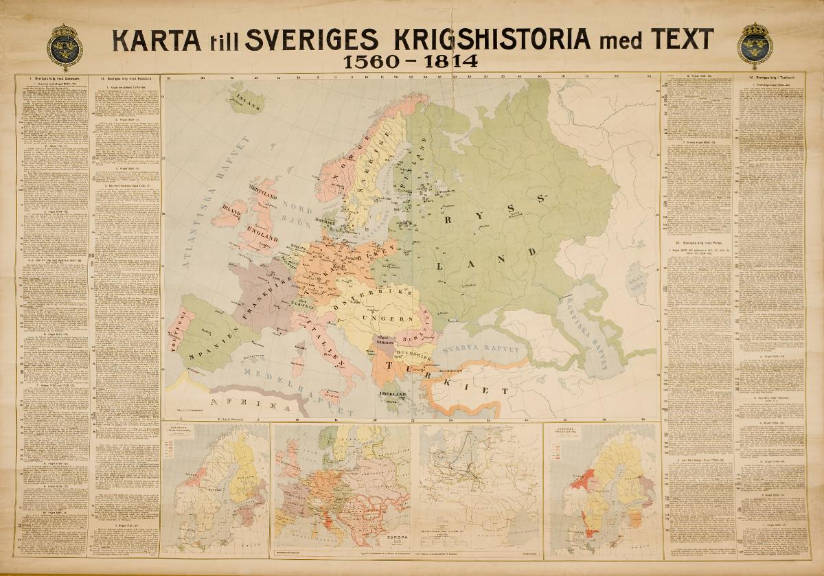 • Väggkarta över Europa med Sveriges krigshistoria med text 1560-1814