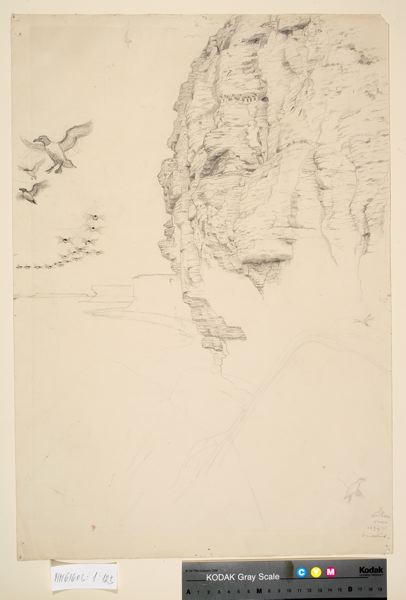 • Blyertsteckning av Olof Gylling Motiv: Stora Karlsön, havsstrand med klippor. Fågelberg med alkfåglar