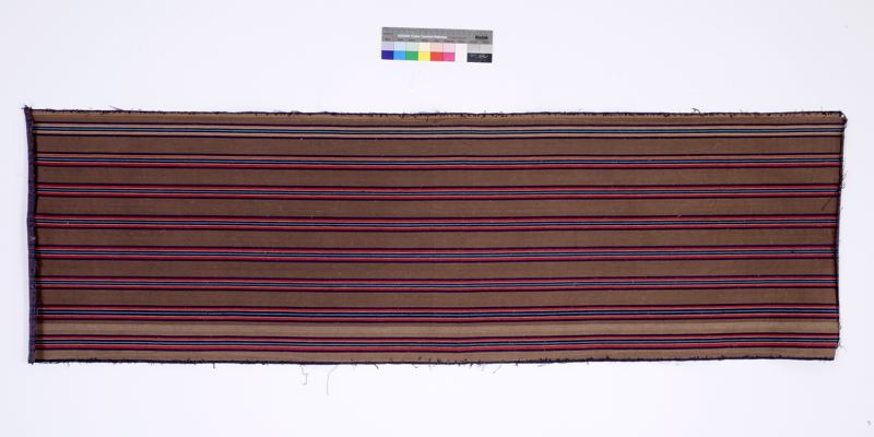 Stoppad kudde, rektangulär i brunt bomullstyg med ränder i rött och grönt. Möjligen maskinvävt? Vid inventeringen 2007 finns ingen stoppning och kudden är isärsprätt till ett tygstycke.