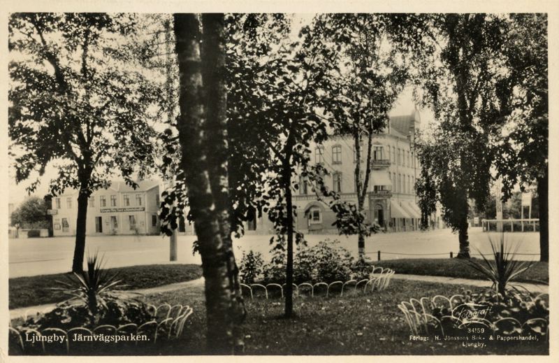 Brevkort skrivet av Åke och gunnar till Fru Anna Assarsson, Marieholm. Daterat och poststämplat den 07 / 04 / 19..? i Ljungby. Motiv: Järnvägsparken i Ljungby.