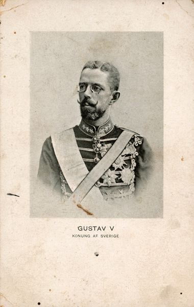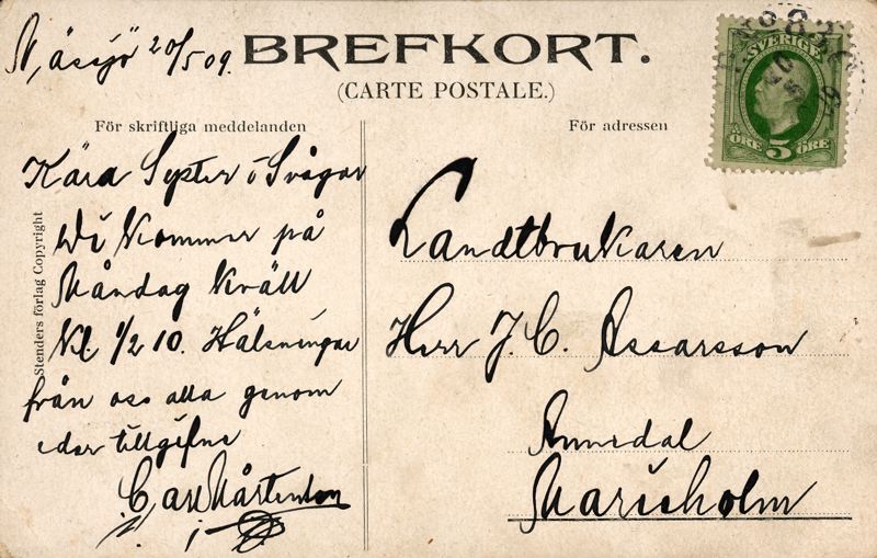 Brevkort skrivet till Landtbrukare Herr J.C. Assarsson, Annedal, Marieholm. Daterat och poststämplat den 20 / 05 / 1909. Bild: Gustaf V. kung av Sverige 1907-1950.