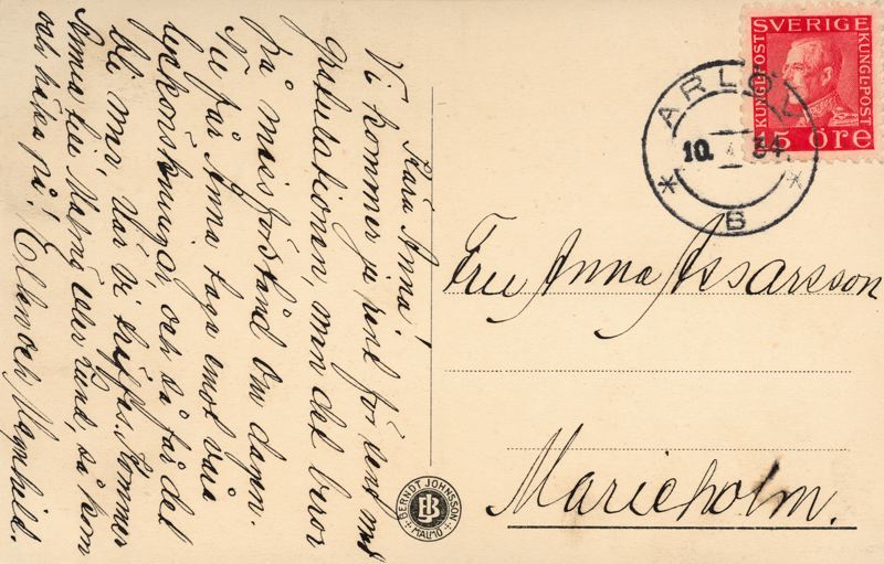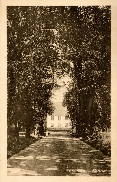 Bild av ett parti av Kronotorps slott och parken. Brevkort adresserat till Fru Anna Assarsson, Marieholm. Daterat och poststämplat den 10 / 04 / 1934 i Arlöv.