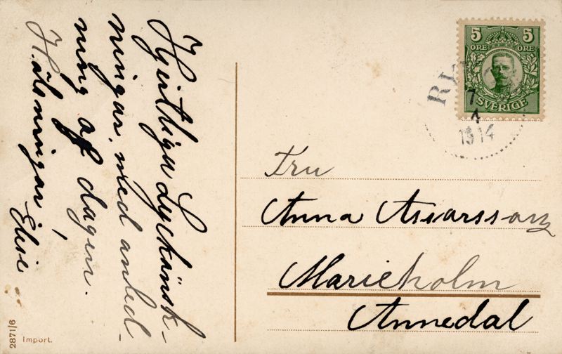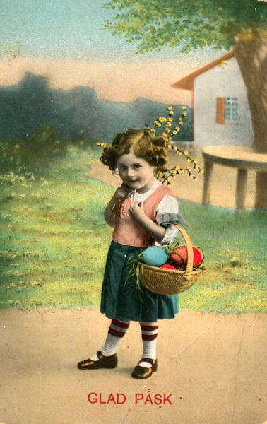 Brevkort adresserat till Anna Assarsson, Marieholm, Annedal.Daterat och poststämplat den 07 / 04 / 1914.Bild: En flicka med korg full med påskägg.