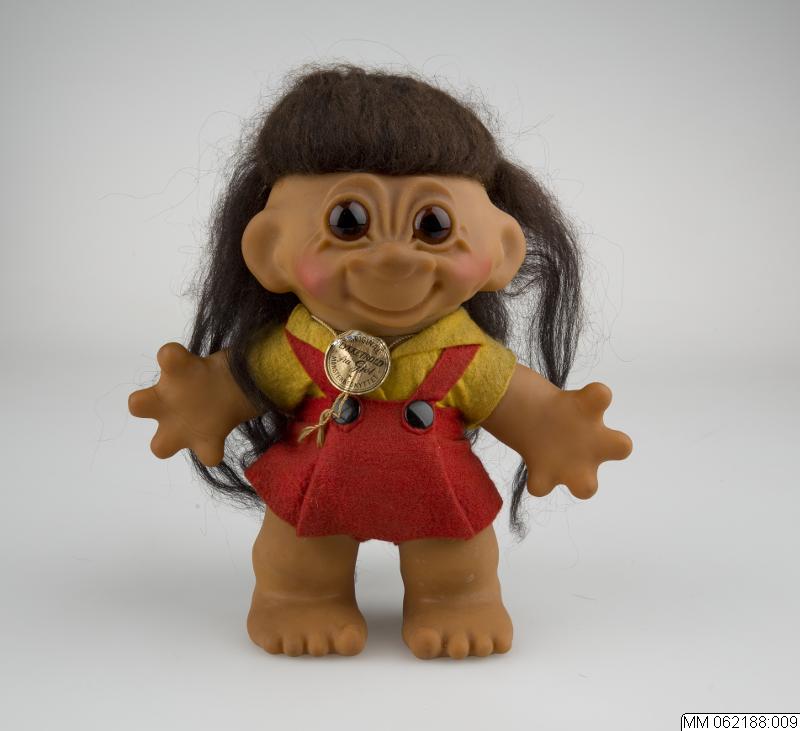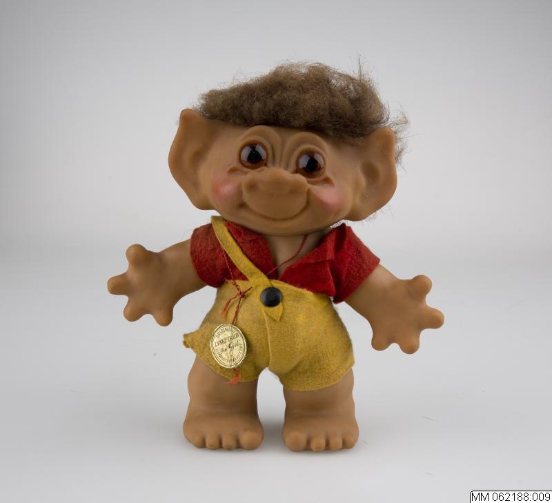 2 st lyckotroll med breda leenden av formpressad brun plast. a. 23 cm högt troll med brunt spretigt hår iklädd originalkläder i filt, röd tröja och gula byxor fastsydda på kroppen. På ryggen varumärket "Thomas Dam". Under foten stämplad "Made in Denmark". Pappersettikett bevarad med texten "original lykketrold fra Gjöl". b. 23 cm högt troll med brunt spretigt hår iklädd originalkläder i filt, gul tröja och röd kjol fastsydda på kroppen. Pappersettikett bevarad med texten "original lykketrold fra Gjöl".