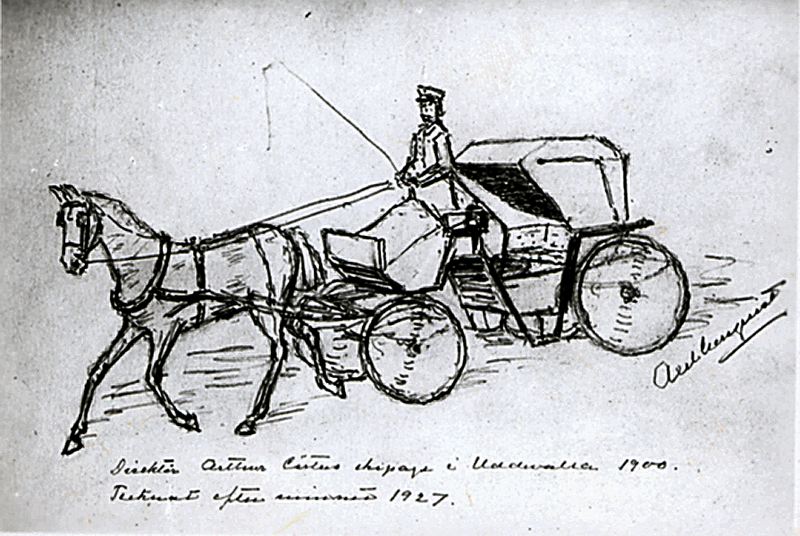 Inskrft: Directör Artur Cösters ekipage i Uddevalla 1900. / Tecknat efter minnet 1927.